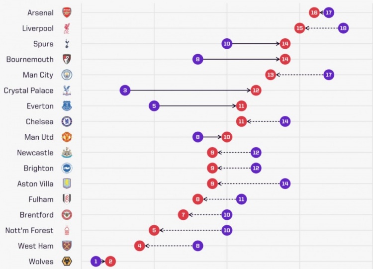 10月13日讯 OPTA统计了英超球队本赛季前7轮与上赛季前7轮的积分情况,水晶宫+9分最多,阿森纳、利物浦、曼城、切尔西均减少,曼联、热刺增加。
