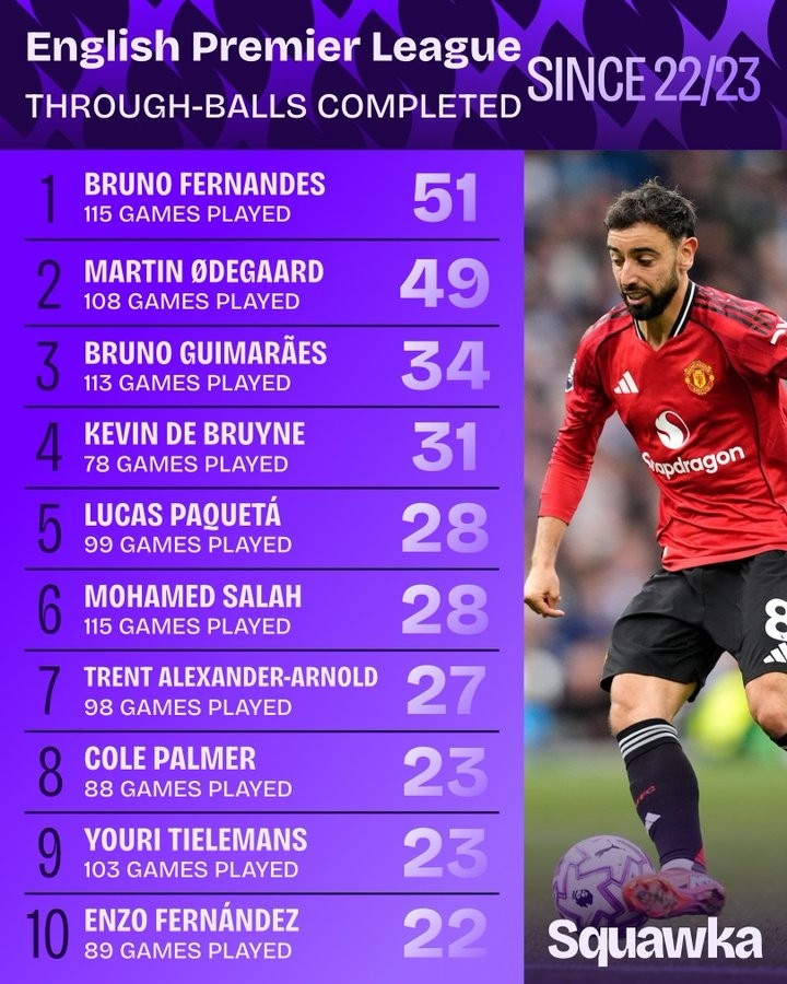 10月13日讯 根据数据机构Squawka的统计,自2022/23赛季以来,B费在英超联赛中以115场比赛完成51次成功直塞的数据高居榜首。厄德高以108场比赛送出49次直塞的成绩紧随其后,位列第二。