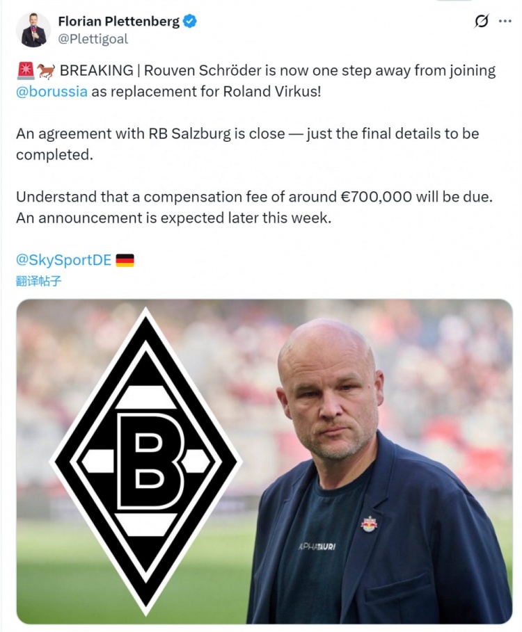 媒体指出,门兴有意聘请萨尔茨堡总监施罗德,让其成为俱乐部的新任总监,以替代离任的维尔库斯,门兴接近与萨尔茨堡达成协议,只剩最后细节有待敲定,补偿金约为70万欧,预计本周晚些时候官宣。