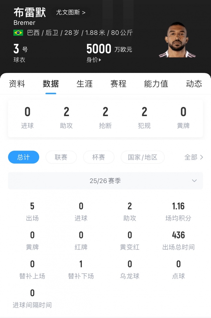 布雷默去年10月遭遇十字韧带断裂重伤,今年8月重返赛场,本赛季他为尤文出场5次,他上一次为球队出场是9月28日1-1战平亚特兰大的比赛。