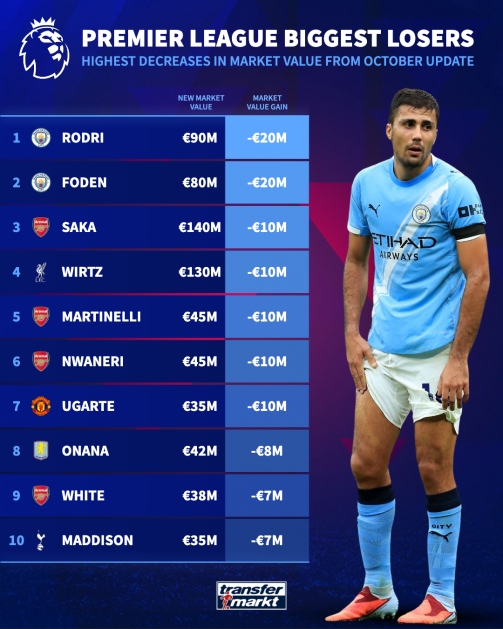 10月17日讯 德转更新英超身价,其中跌的最多的是罗德里和福登,他们身价都下降了2000万欧。