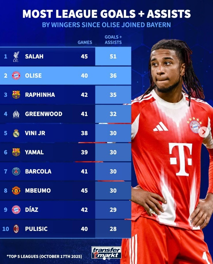 10月18日讯 在德转最新一期球员身价更新中,奥利塞身价上涨3000万欧,达到1.3亿欧。德转也盘点了自奥利塞自加盟拜仁之后,五大联赛所有边锋球员在联赛中参与进球榜,奥利塞仅次于萨拉赫高居第二,具体如下(进球+助攻):